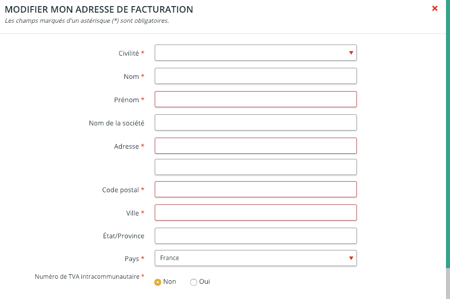 L’adresse de facturation est obligatoire. Vous pouvez ajouter, modifier ou supprimer une adresse de facturation. Assurez-vous que l’adresse de facturation et les détails de votre commande sont exacts.
