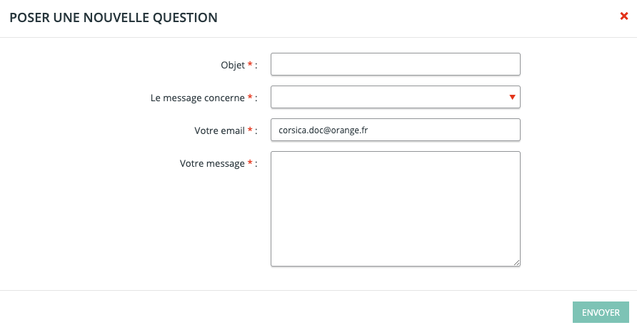 Afin de poser une question, il suffit de cliquer sur le bouton “Poser une nouvelle question” et de remplir les champs obligatoires de la fenêtre pop-up.