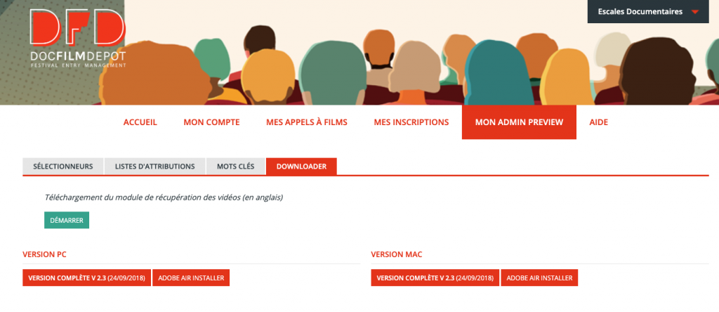 Dans le menu « MON ADMIN PREVIEW », à l’onglet Downloader, vous trouverez des liens vers les fichiers .dmg (Mac) ou .exe (PC) pour installer DocfilmdepotDownloader sur votre ordinateur.