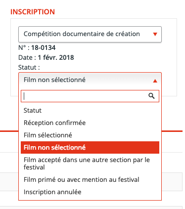 « Film accepté dans une autre section » : Il s’agit d’un statut différent du statut « film sélectionné » classique. Il est utile dans les cas où les films correspondent à des programmes spéciaux, comme par exemple les rétrospectives ou thématiques, sans forcément que cela corresponde aux sections/compétitions saisies dans votre appel à films Docfilmdepot.