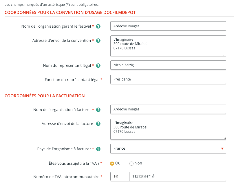 À la création de votre compte, il est très important de remplir les champs obligatoires figurant dans « Mon profil » tels que les coordonnées pour la convention d’usage Docfilmdepot et les coordonnées pour la facturation.