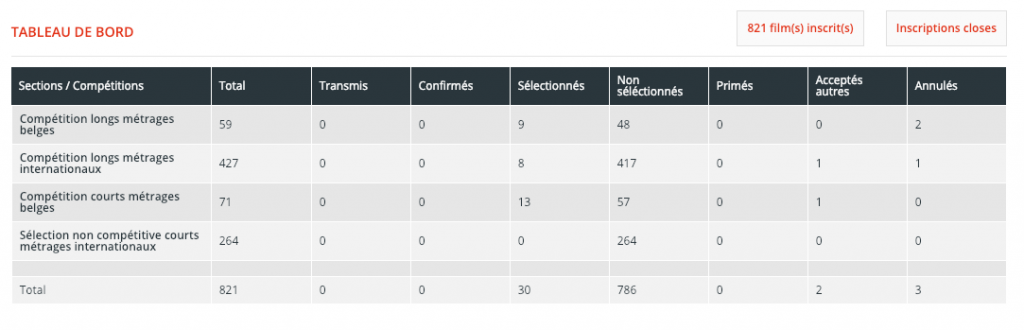 Le tableau de bord vous permet d’avoir un aperçu récapitulatif de vos données d’inscriptions très rapidement en présentant les états des inscriptions par section/catégorie et par statut (inscriptions transmises, inscriptions confirmées, films sélectionnés, non sélectionnés, primés, acceptés dans une autre section, et les inscriptions annulées).