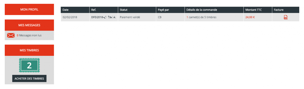 Vous trouverez un tableau récapitulatif de vos achats de timbres affichant les entrées suivantes : la date d’achat des timbres, le numéro de commande, le statut de votre commande (si le paiement est en attente de validation ou bien s’il a été validé), le mode de règlement (carte bancaire ou virement), le détail de la commande, le montant TTC de la commande et enfin la possibilité de télécharger votre facture au format .pdf en cliquant sur le pictogramme de la colonne facture.