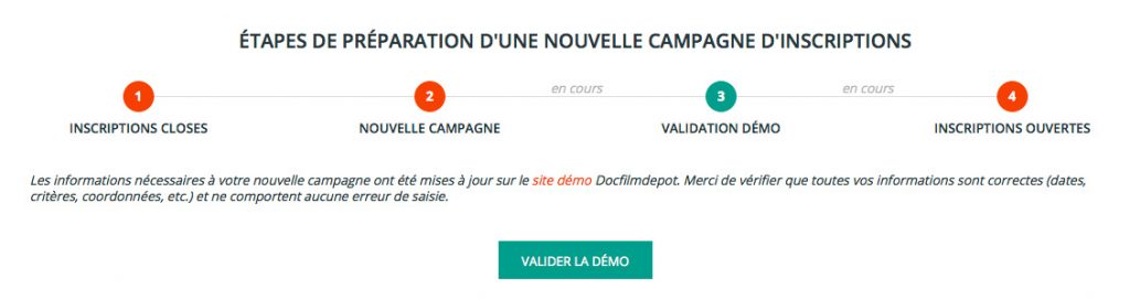 Votre festival n’est visible qu’à travers ce compte de tests, aucun autre utilisateur ne pourra s’inscrire à votre festival avant la validation de votre démo et l’ouverture réelle des inscriptions.